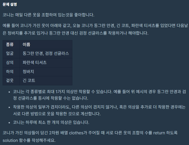그럼 결국 조합 문제인건데 해쉬에 들어가있는 이유는 그냥 딕셔너리로 종류별 개수를 카운트하기 때문인 것 같습니다.