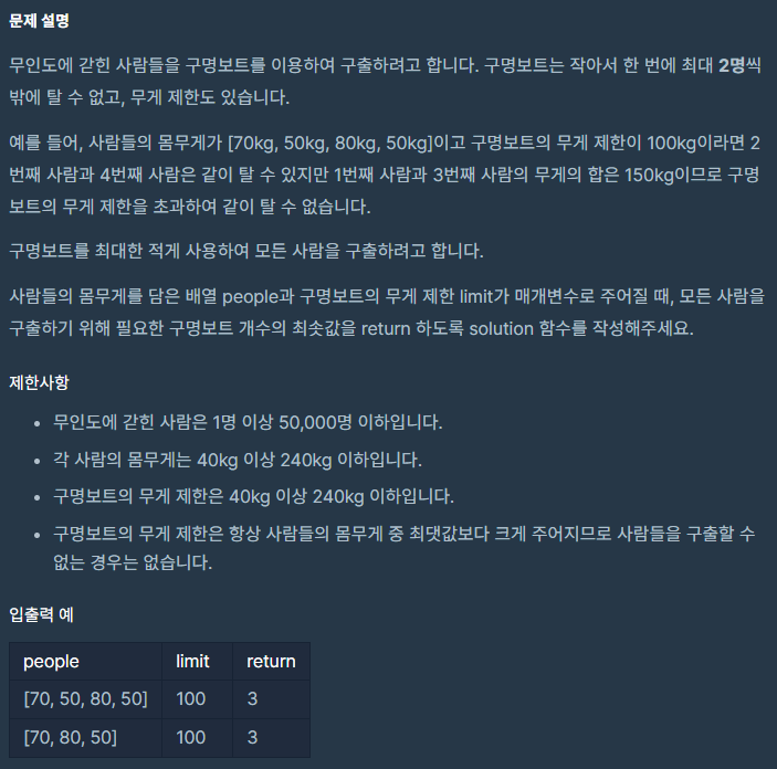 - 그리디로 정렬 후 deque에서 하나씩 뽑아가며 보내면 되는 문제인데 주어진 조건 중 보트에는 최대 2명만 탈 수 있습니다 를 못봐서 몇 번 틀렸습니다. 제한사항에 안적어둬서 방심했네요..