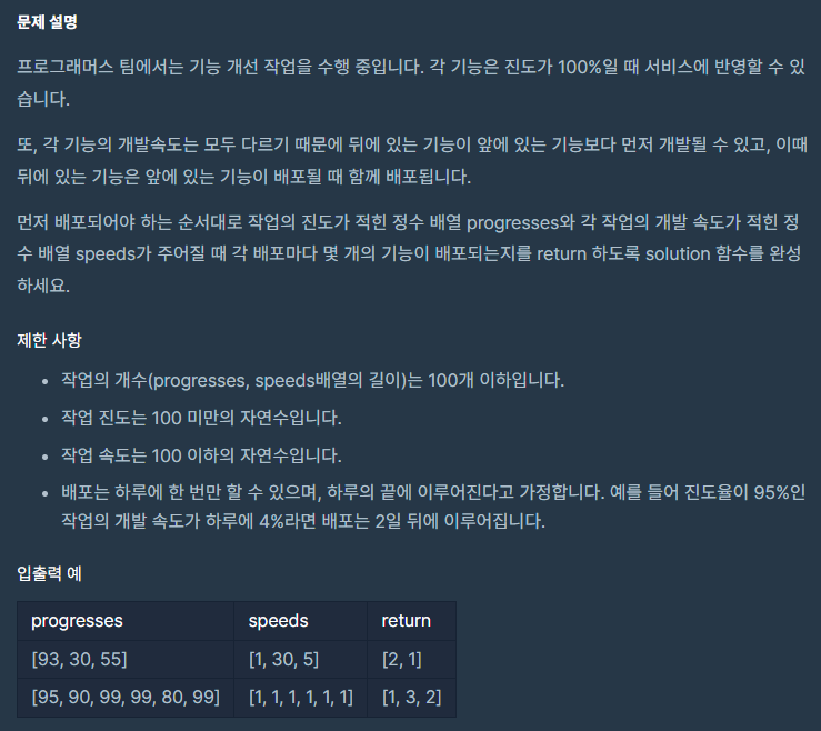 1. 왼쪽 끝에 있는 것부터 끝내야 하므로 progress와 speeds를 deque로 변환