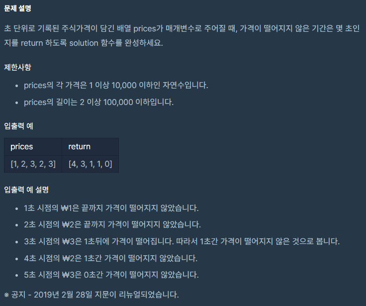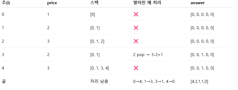 stack은 몇 초가 지났는지 넣는다고 생각하시면 되고 while문 내부에서는 stack의 -1번째 초가 지났을 때 주식이 떨어졌는지 아닌지 확인한다고 생각하시면 됩니다.