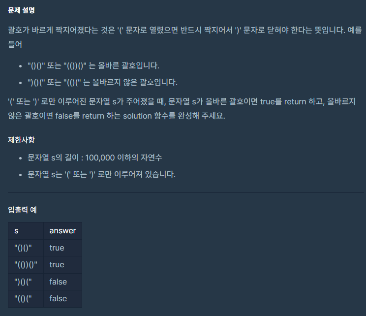 stack이 비어있는 상태에서 )가 나올 경우에는 문제가 있는 것이므로 false를 반환하고 과정이 다 끝났는데 stack이 비어있지 않아도 false를 반환하고 그 외에는 true를 반환하면 됩니다.