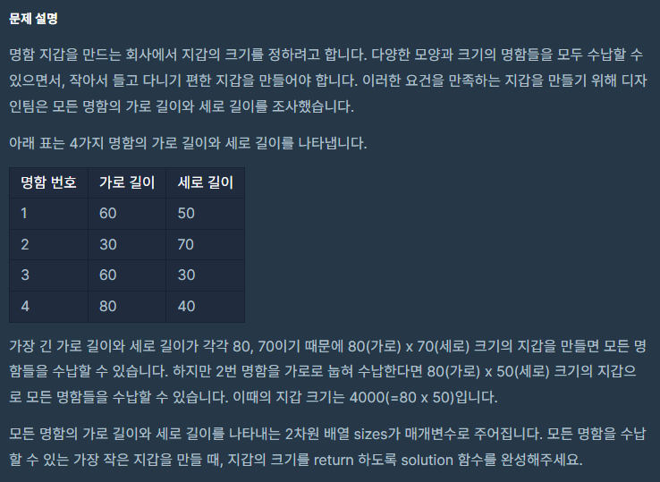다만 i.sort()라는 정렬 과정이 없으면 가로세로 길이의 최댓값을 찾는 과정이 꼬이기 때문에 반드시 정렬해야 합니다