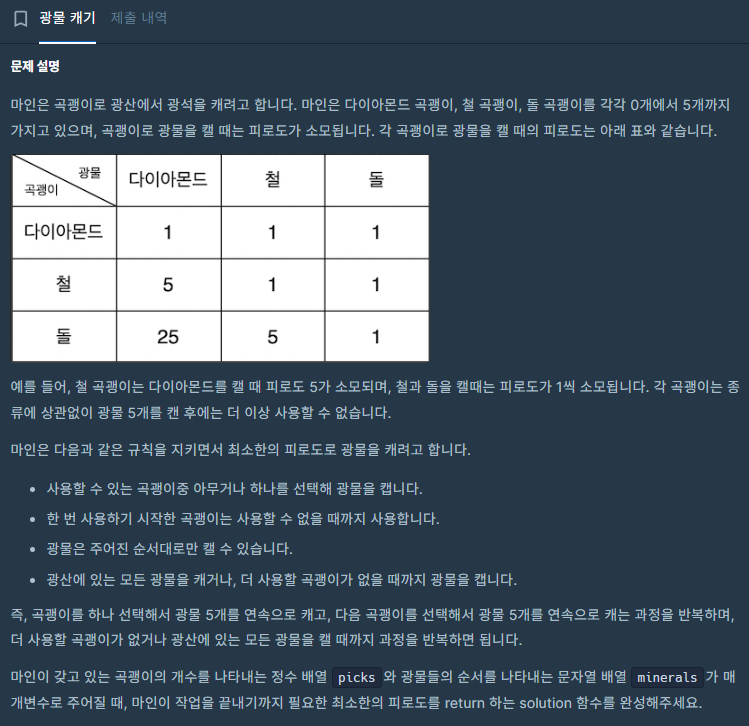 - 채굴하는 공괭이와 광물의 종류에 따라 분기하며 answer에 피로도를 더해주면 끝