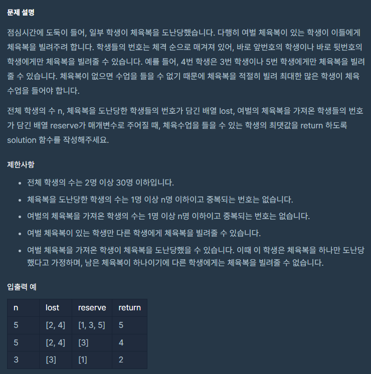 풀다가 분명 논리에 문제 없는데 왜 자꾸 터지지 해서 다시 지문을 읽어보니 조건 중 "여벌 체육복을 가져온 학생이 체육복을 도난당했을 수 있습니다." 라는 문구 때문에 터지는 것을 알았습니다. 악랄하네요.. 이게 레벨 1.....?